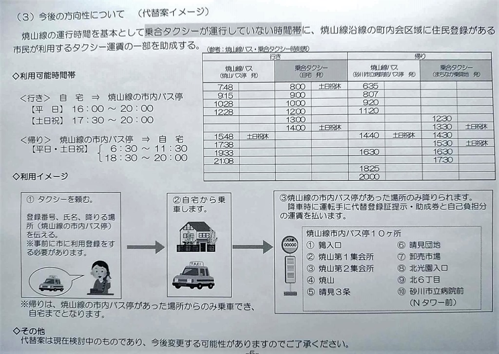 参加はすごく少なく私を含めて5名でした。この段階で砂川市から焼山線廃止の方向性が出されましたが、参加者から反対の声はありませんでした。
