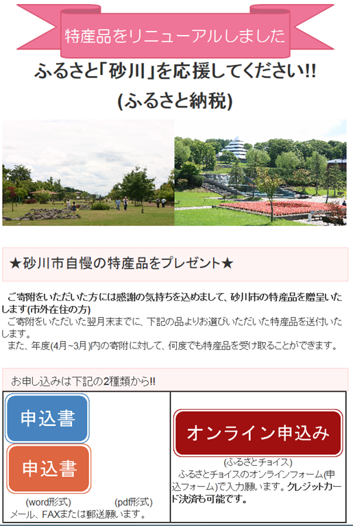 砂川市の「ふるさと納税」のページは「こちら」から。
