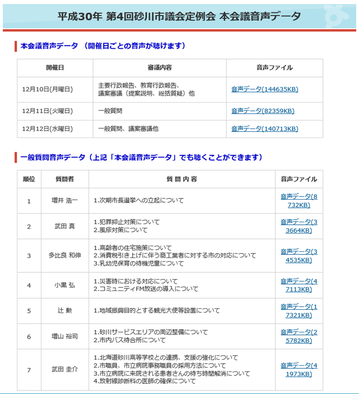 砂川市議会のHPに12月議会の「本会議音声データ」が公開されましたのでリンクします。音声データには12月議会の本会議場でのやり取りが全て公開されていますが、「一般質問」については上の写真のように別枠で公開されています。