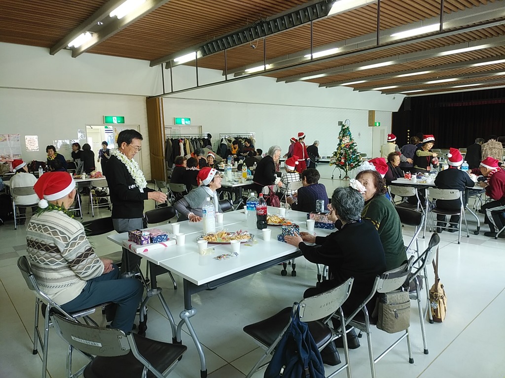 ちょっと見学させていただきましたが、「クリスマス会」の真っ最中でした。ゲームやボランティアさん達の踊りなど、盛りだくさんで参加の皆さんはとても楽しそう。