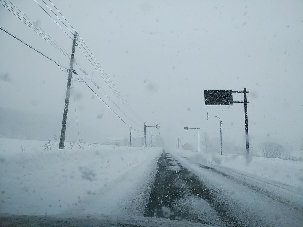 写真は今日の午後ですが、一時、ホワイトアウトに近い感じになって運転しづらい時がありました。周りの景色はほとんど見えません。それでもまだ、積雪が少なく道路のアスファルトが出ていて大丈夫。
