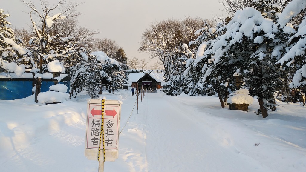 上の写真は雪が少し落ち着いた午後3時30分ごろの砂川神社です。日も射して黄金色に輝く冬景色が何とも良い感じでした。