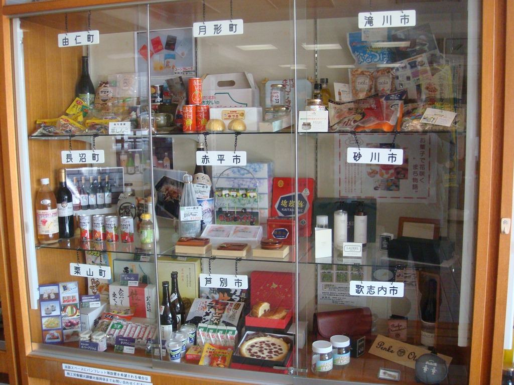 空知総合振興局のロビーには10市14町の名産品を置く棚があります。各市町が工夫を凝らして狭いスペースを飾るのですが、砂川市はローレルの化粧水とソメスサドルの革製品でした。棚の後ろには、スイートロードのチラシが張ってあります。