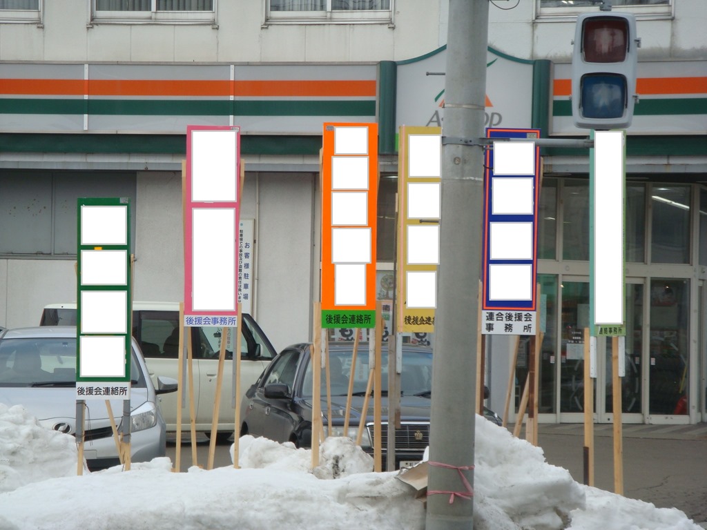 さて、上の写真ですが、さすがに選挙が確定している滝川市は立て看板が林立して賑やかになっていました(隣り町ですから加工は必要ないと思いますが・・・)。それに比べ砂川市内はシーンと静かです。