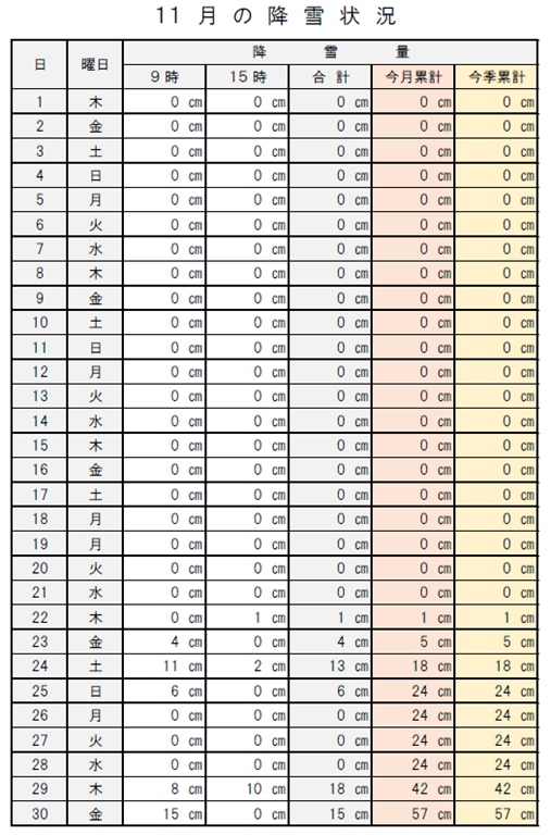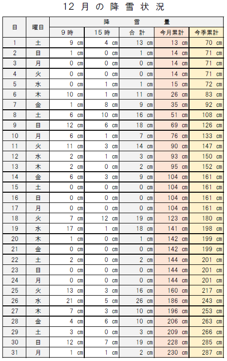 上の表は平成30年11月と12月の降雪状況です。11月が57㎝、12月は230㎝で累計287㎝。
