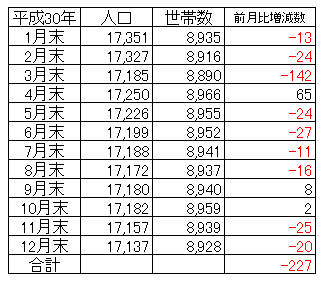 「広報 すながわ 1月15日号」に12月末現在の市の人口が掲載されています。砂川市の平成30年1月~12月までの人口の動きは下の表です。
