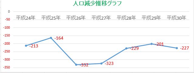 上のグラフは私が作った簡単なエクセルの表です。年ごとに人口減少数をグラフにしてみました。300人以上の減少が続いた時もありました。