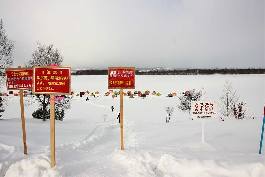解禁前にその箇所で管理棟の職員さんが氷の厚さを計測する作業中、氷が割れて膝まで落ちたそうです。絶対に無理はしないで看板等の指示に従って釣りを楽しみましょう!
