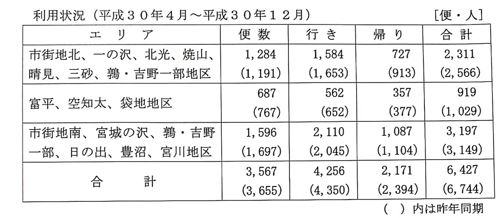 ★「予約型乗合タクシー」の利用状況は以下のようです。砂川市も路線バスは減少していますので公共交通手段として採用している制度です。