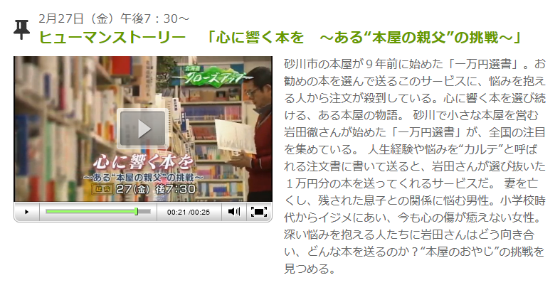 写真は2月27日(金)午後7:30~の北海道クローズアップで、ヒューマンストーリー 「心に響く本を ~ある“本屋の親父”の挑戦~」と題して、砂川市内の「いわた書店」が全道ネットで放映されます。