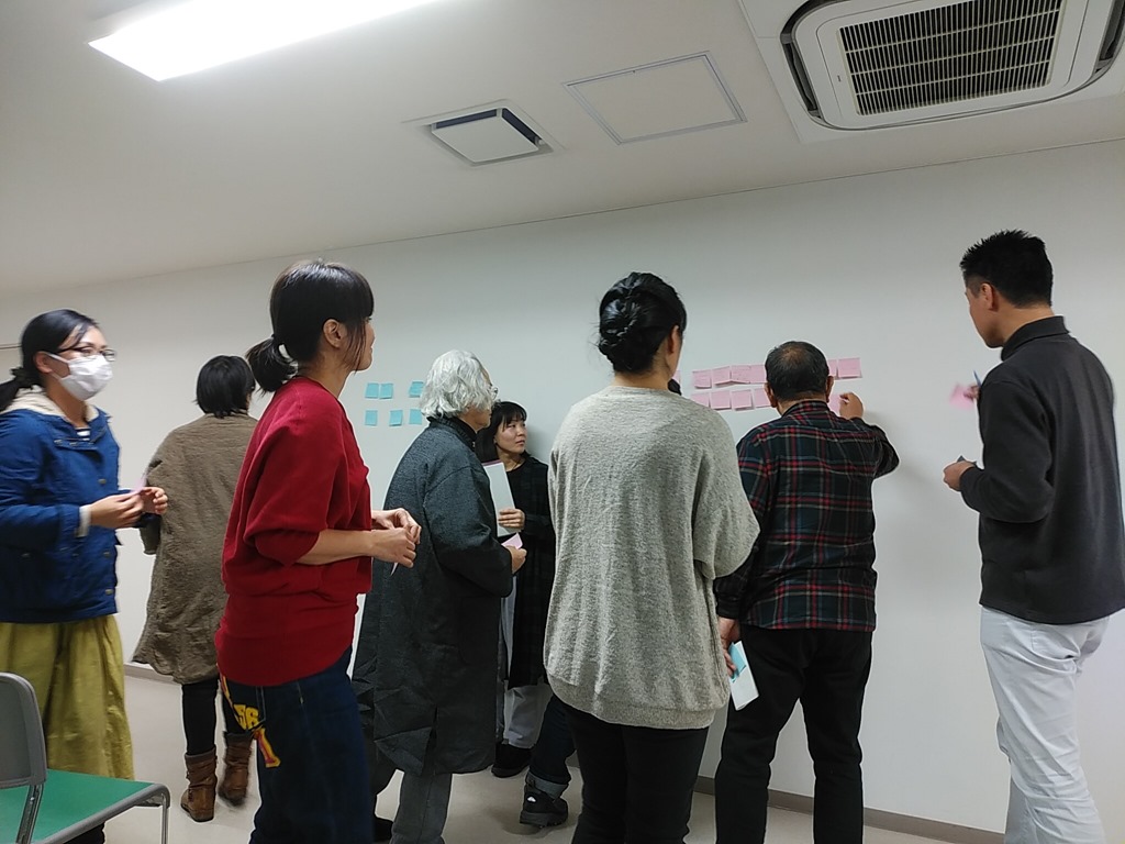 映画は1時間弱、その後、水道民営化に対するメリット(ピンク)・デメリット(水色)をポストイットに書いて、スクリーンがあった壁に貼り付けます(上の写真)。