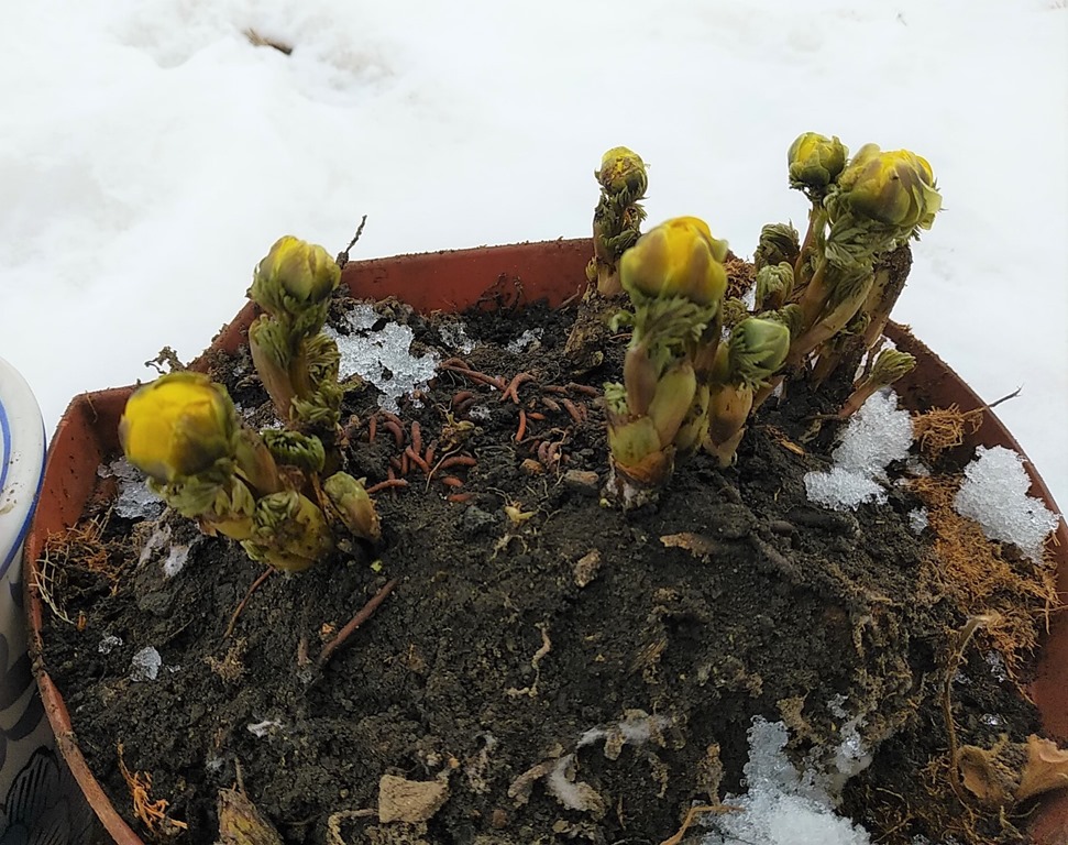上の写真は北海道で春一番に咲く花「福寿草」です。街を回っている途中で見つけました。鉢植えではありますが、硬い蕾が開きかけています。