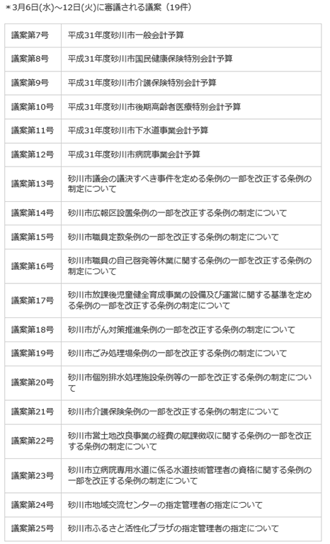 本日の議会は一般質問のあと、提案されている各議案が説明されました。その一覧が以下の写真です。