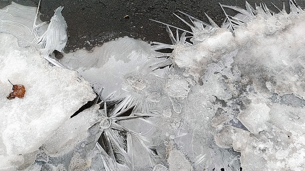 これまで暖かい日が続いて来たので寒さが厳しく感じました。家を出ると水溜りが凍って面白い形なので写真を一枚。