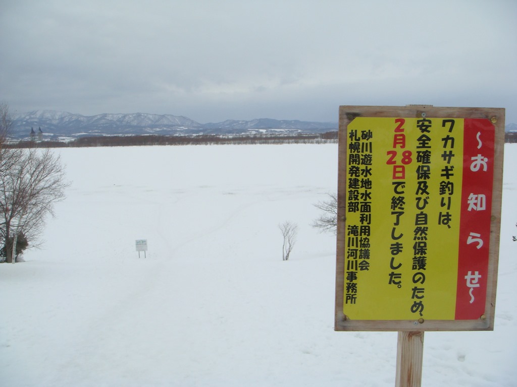 さて、2月が逃げて、3月がやって来ました。昨日、街を回っている途中で見つけたのがこの看板です。2月いっぱいでオアシスパークの「ワカサギ釣り」が終了したとのお知らせです。釣り客で賑わっていたオアシスパークですが、すっかり寂しくなりました。