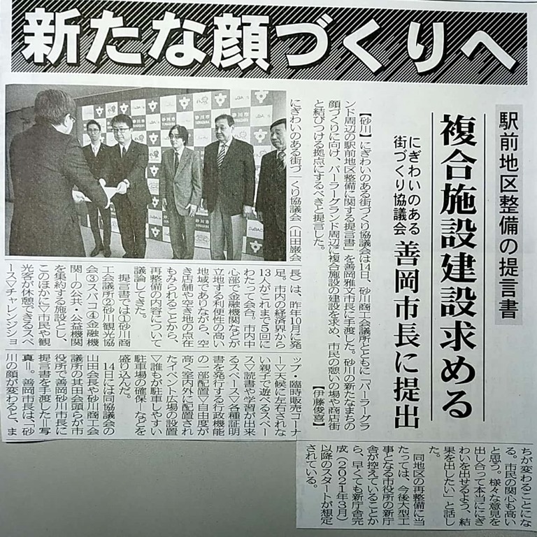 上の記事は砂川商工会議所とともに、にぎわいのある街づくり協議会が14日に「パーラーグランド周辺の駅前地区整備に関する提言書」を市長に手渡したという内容です。