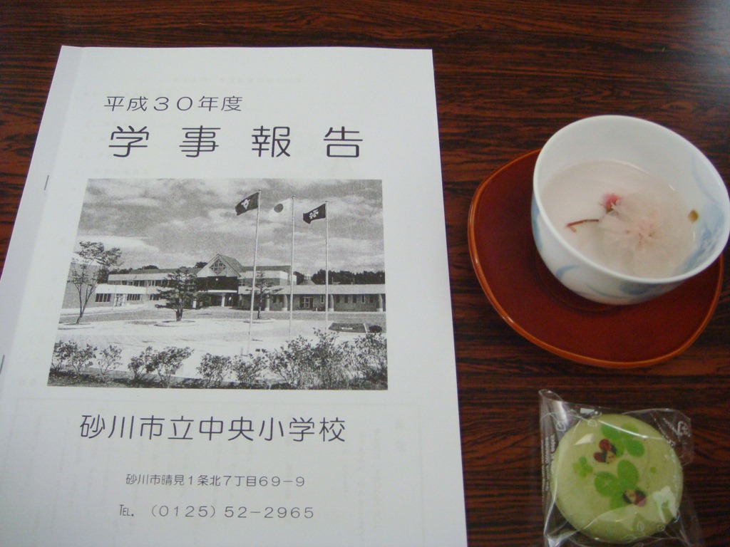 午前10時前に中央小校長室に行くと写真左のような春らしいお茶を出していただきました。本日の卒業生は30人です。卒業生の名簿を見ると、もう「子」の付く名前を見つけることは出来ません。