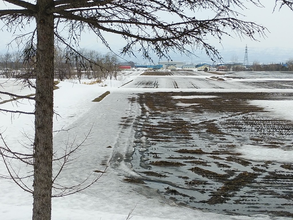 市内南の農村地区では雪解けが進んで田んぼの土が出てきました。スマホのカメラでは無理ですが、遠くでは白鳥が落穂を食べています。
