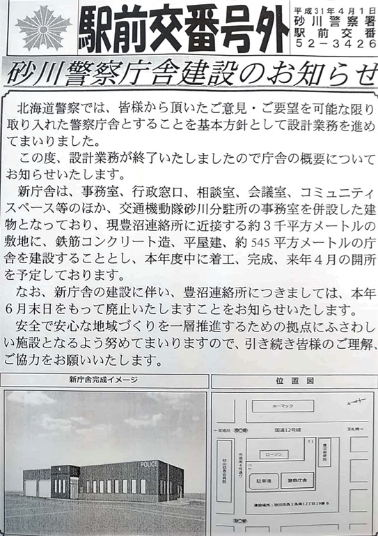 家に戻ると上の「駅前交番号外」が届いていて、町内会に回覧します。内容は滝川警察署と統合され新しく建設される「砂川警察庁舎」のことでした。