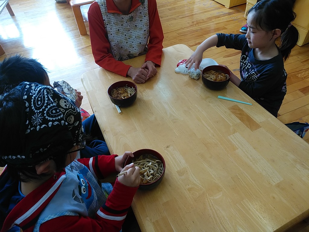 本日のメニューは「カレーそば」。愛好会のカレーそばは私が3杯もお替りしたほど美味しいので、子ども達も大喜びでした。