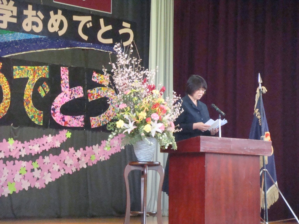 今年の新入生は19名です。少なくなってしまいました。右の写真は校長先生の式辞の場面ですが、中央小学校では初めての女性の校長先生で阿久津淳子先生です。