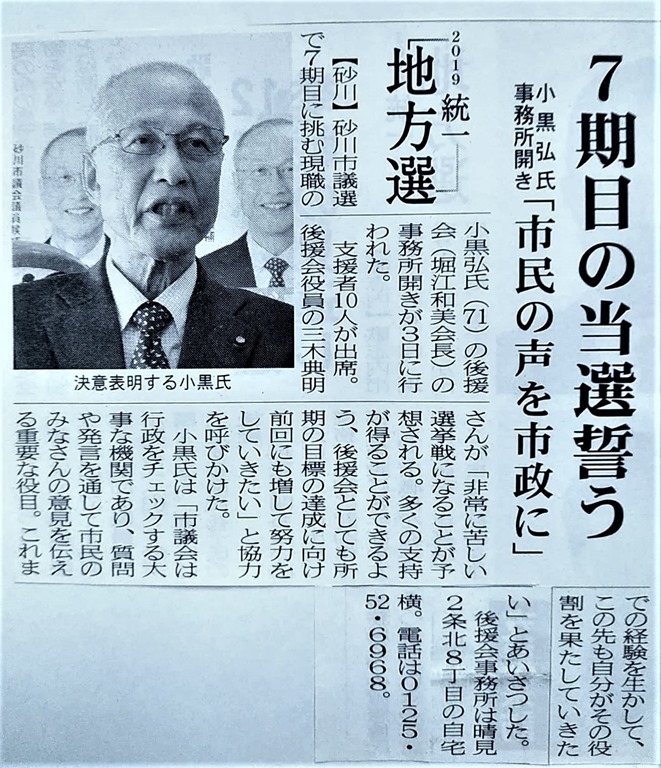 地元紙であるプレス空知では、4月14日告示の砂川市議会議員選挙に立候補予定者の後援会事務所開きの様子を記事に掲載してくれています。