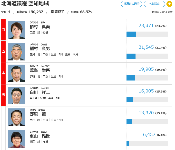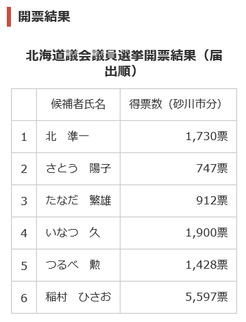 続いて北海道議会議員選挙の空知地域の結果は