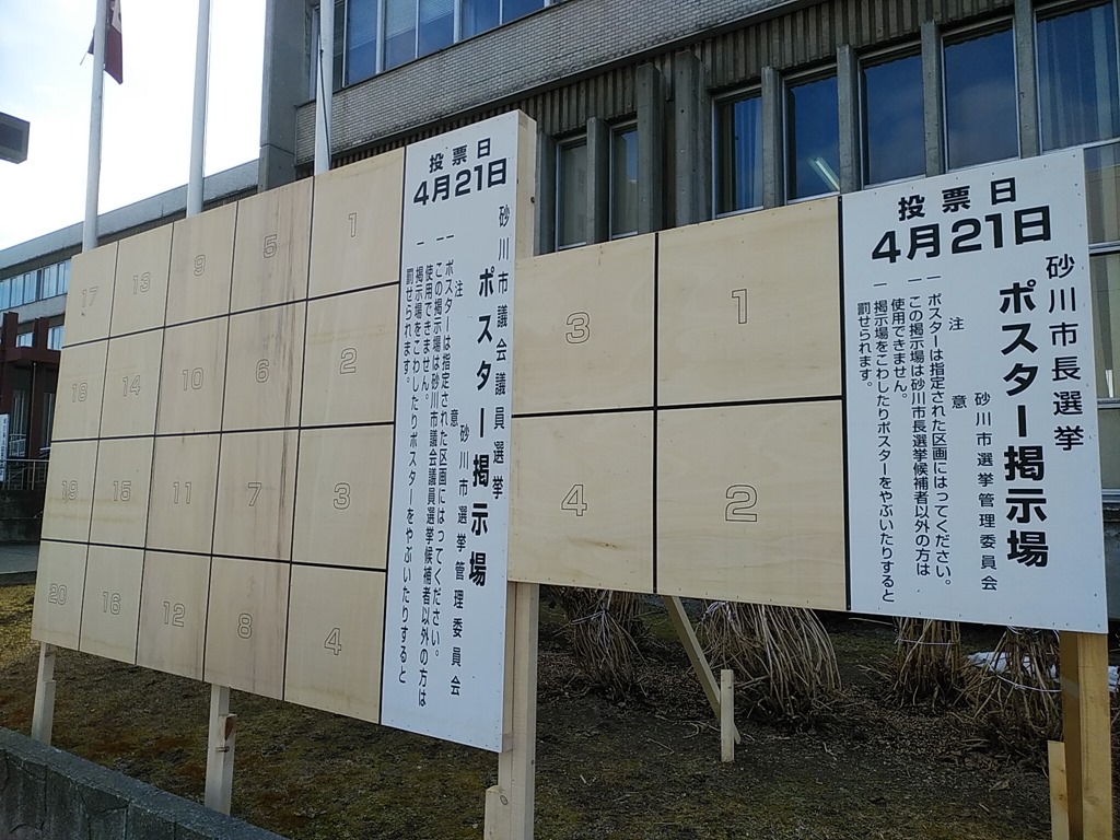 統一地方選の前半が終わったと思うと、いよいよ後半の市長・市議選のポスター掲示場が設置されています。