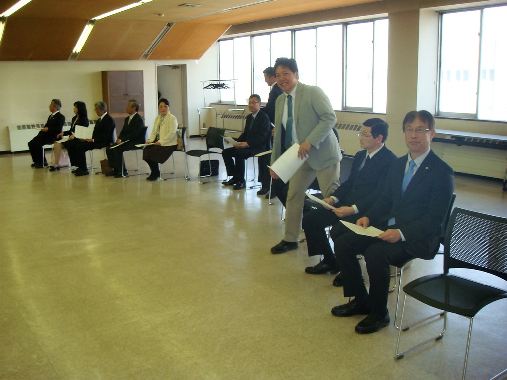 当選した立候補者が並びます。手前から市長、それから得票数の多い議員が順番で並びました。始まる前が上の写真です。議員の対面には選挙管理委員、砂川市、市立病院の幹部職員が座っています。