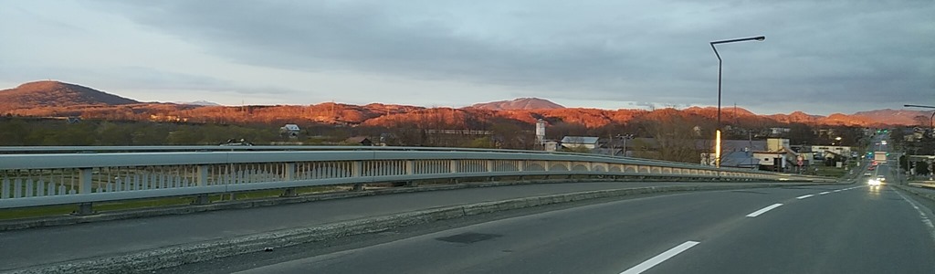 写真ではうまく表現できませんでしたが、夕日に映える山々が赤く染まって、まるで紅葉のような景色に感動しました。