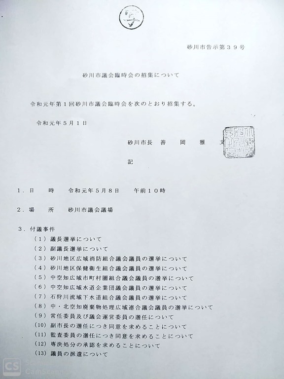 まだ議長が決まっていないので議会事務局長から5月8日(水)午前10時から臨時議会を招集する旨、砂川市長から通知があった知らせが左の写真です。