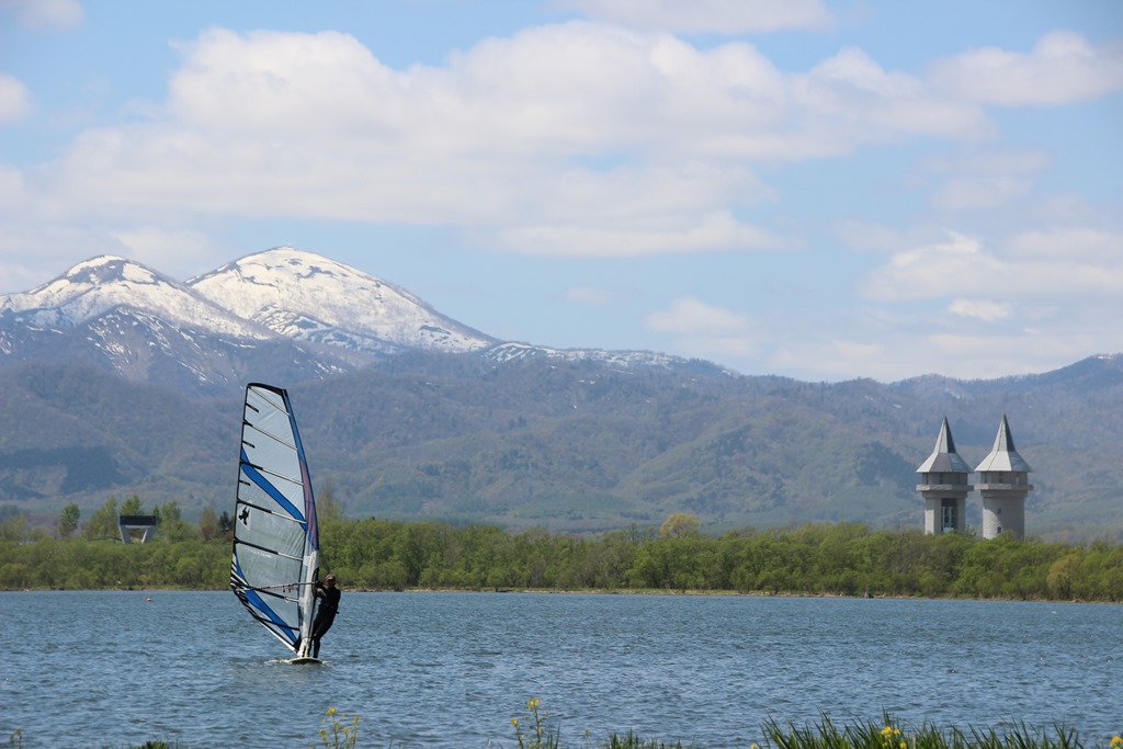 そして、こちらは何とものどかな(やっている人はどうか分かりませんが・・・)景色です。残雪のピンネシリ岳、トンガリ屋根のオアシスパークの水門、そして、ウィンドサーフィンです。