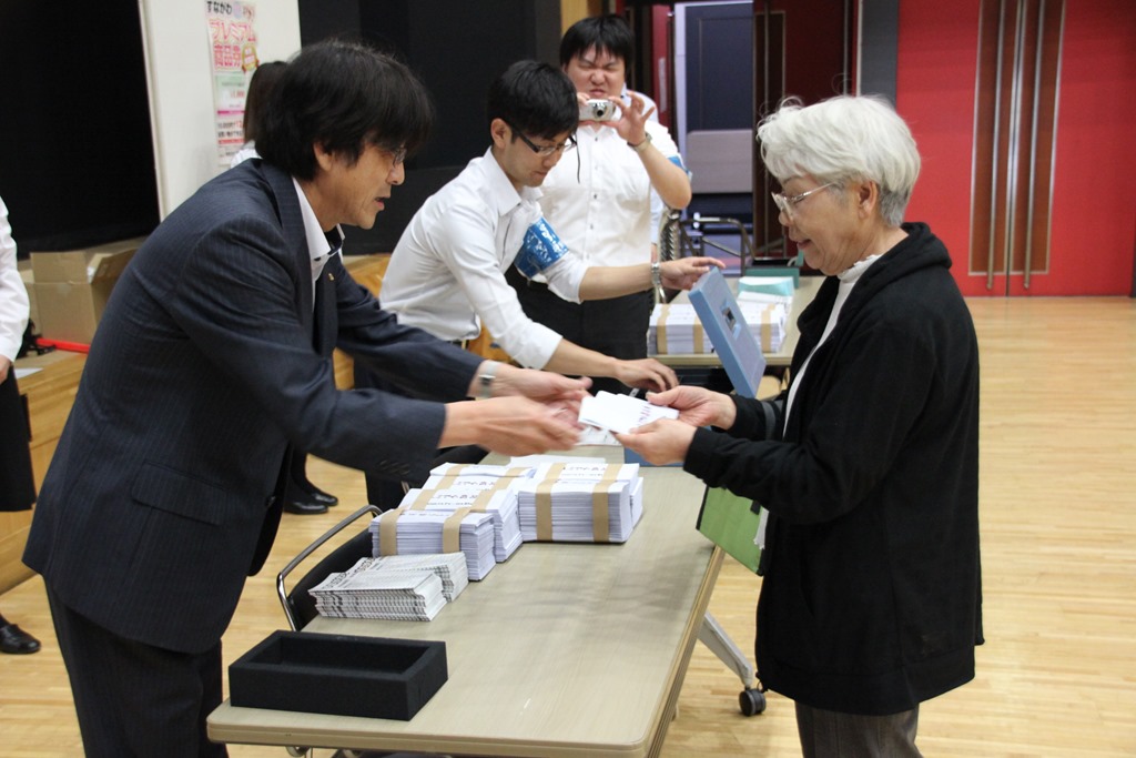 いよいよ午前10時、其田商工会議所会頭の挨拶に引き続き、2000セットが販売されました。写真は一番早く並ばれた方に其田会頭からプレミアム商品券が渡されるところです。