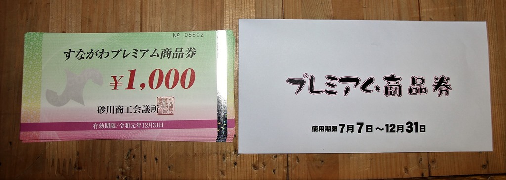 「すながわ プレミアム商品券」は1万円で1万2千円分の買物が出来る商品券で、1000円券が12枚入った1セットを18歳以上の方が2セットまで購入できます。