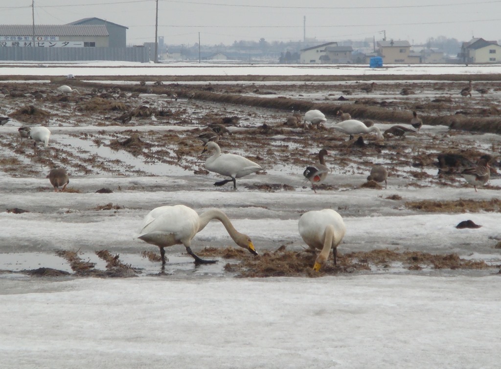 昨日、今日と暖かい良い天気が続き、ダウンを脱いで歩けるようになりました。写真は奈井江町の白鳥です。雪解けも進み田んぼが出ているところでは白鳥が餌を探していました。