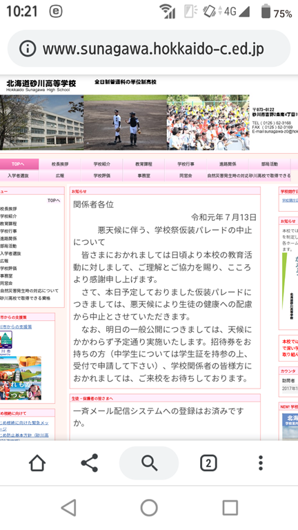 スマホで砂川高校のHPを見ると、仮装パレードが中止になった知らせがありました。残念ながら賑やかな若者たちのパフォーマンスを見ることは出来ませんでした。