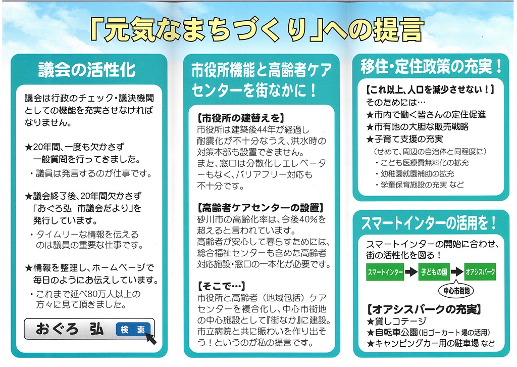 私のリーフレット、いわゆる「討議資料」をUPします。私達、市議選への立候補者は次の4年間で何を提言、提案するのか有権者の皆さんにお知らせして、選挙に臨みます。