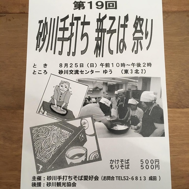 私も会員の「砂川手打ちそば愛好会」主催の「第19回 手打ち新そば祭り」が明後日25日(日)に開催されます。