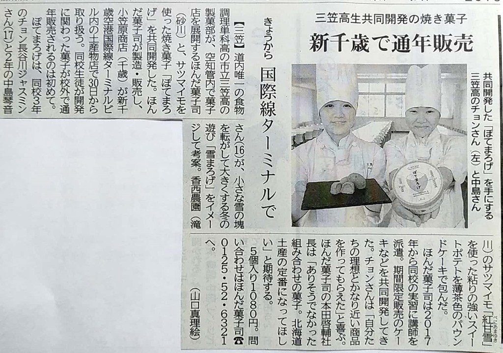 こちらも本日の道新で全道版です。砂川に本社がある「ほんだ菓子司」が三笠高校の製菓部と共同開発したお菓子を新千歳空港で通年販売するニュース。