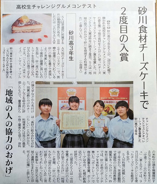 本日の道新です。砂川高校生が高校生チャレンジグルメコンテストで地元食材を使ったチーズケーキで入賞したニュース。