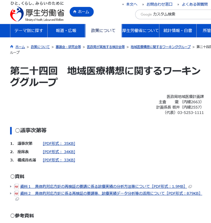 上の写真のページ「地域医療構想に関するワーキンググループ」の参考資料に診療実績データの分析結果が公表されていました。