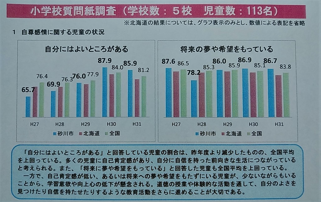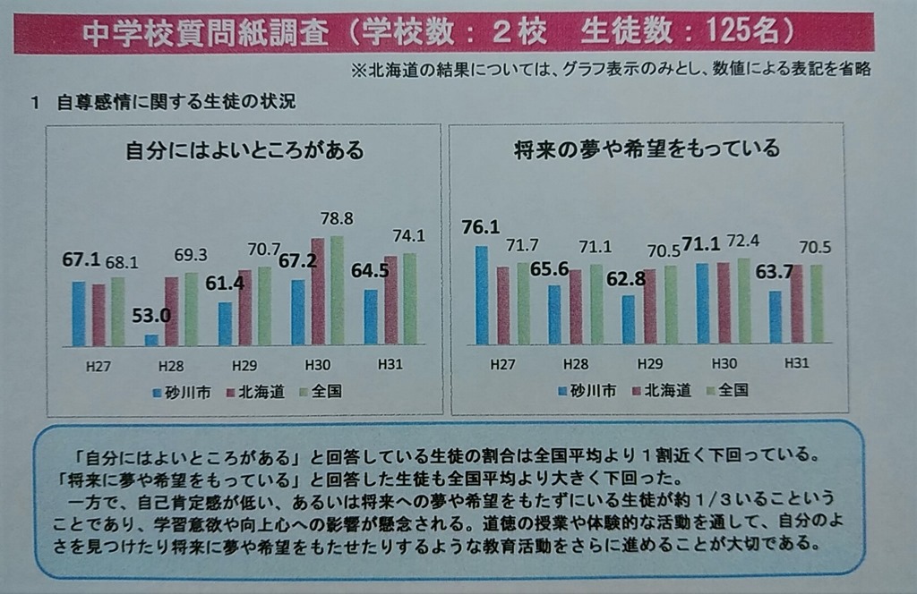 みんなよいところは絶対あると思いますが、ちょっと低いんですネ。また、将来の夢や希望についても全道、全国平均より低くなっています。