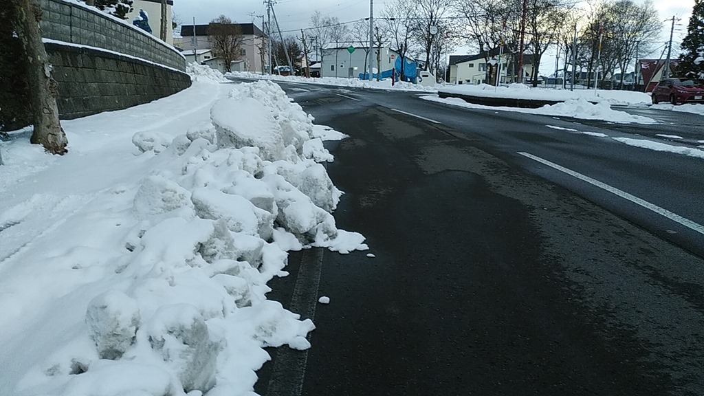 2日間降った雪で除雪車が入って、玄関前も硬い雪が置かれました。まずは家の前の「雪はね」です。