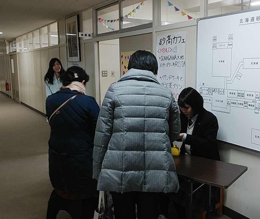 ところが今日は、~砂川高校の3年生が3月の卒業を控えて、今までのお礼を兼ね、今までお世話になった街の方々をご招待し、1日限りのカフェを開店します。砂川愛で一杯の私たちが、みなさんを美味しいスイーツでおもてなししますので、200円持参の上、是非来店(来校)ください!!~(チラシから)