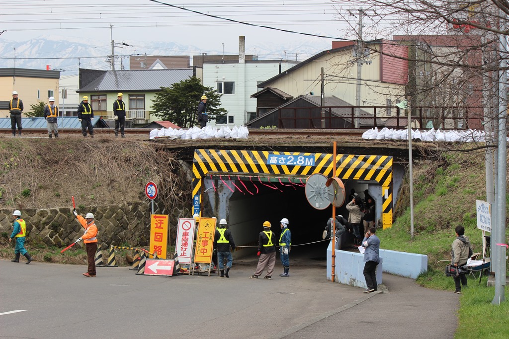 私が現場に行ったのは9時50分ごろ、テレビカメラも来たりして、これから復旧工事が始まるところでした。車は通行止めで迂回を指示されていますが、歩行者の通行は可能となっていました。