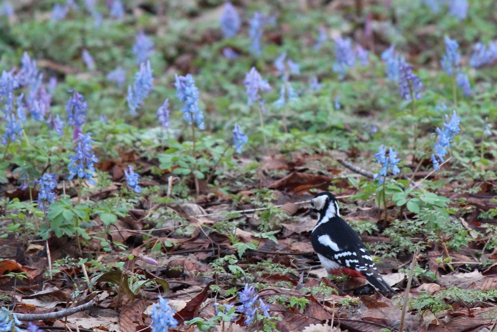 さらに、巨大な望遠レンズが並ぶ撮影スポットも雨と時間外で静かになっていて、偶然にもエゾエンゴサクの花見をするアカゲラの雌の写真を撮ることができました。