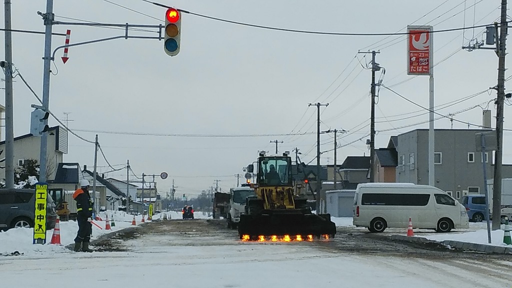 北海道では雪が降っても道路工事は続きます。赤信号で前を見ると、火を噴きながらブルドーザーが走っているではありませんか。思わず写真を撮りました。凄いです。