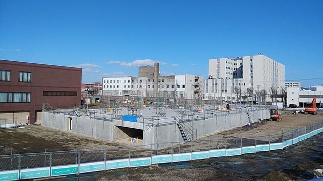 いつも見ている反対側から見た新庁舎建設現場です。一階部分の基礎が出来上がり、これから柱が立ち上がってくるそうです。