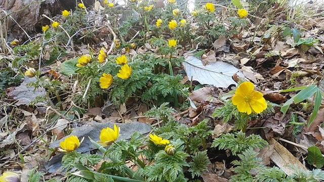 左が福寿草の群生と右はエゾエンゴサク。鶴沼公園のカタクリもいつもは5月の連休前が見ごろですが、相当早いかもです。