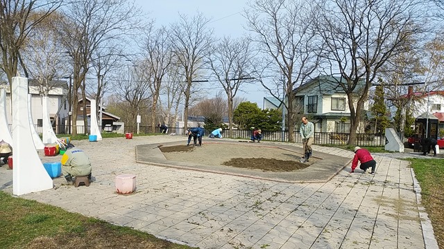 せめて、子ども達が公園で遊びやすいように冬の間、雪の下で固くなった砂場にスコップを入れたり、伸び始めた雑草取りをして、すっかりキレイになりました。